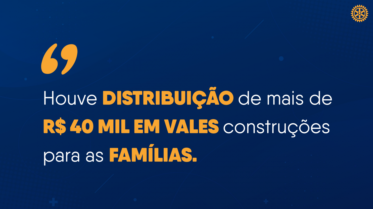 Doamos mais de R$ 40 mil em vales construção, um gesto de apoio que continua a alimentar o processo de reconstrução em nossa comunidade. Estes vales, financiados através de doações via Pix e o suporte de empresas locais, são essenciais para assegurar que as famílias afetadas pelo desastre possam avançar na reconstrução de suas vidas com todas as ferramentas necessárias.