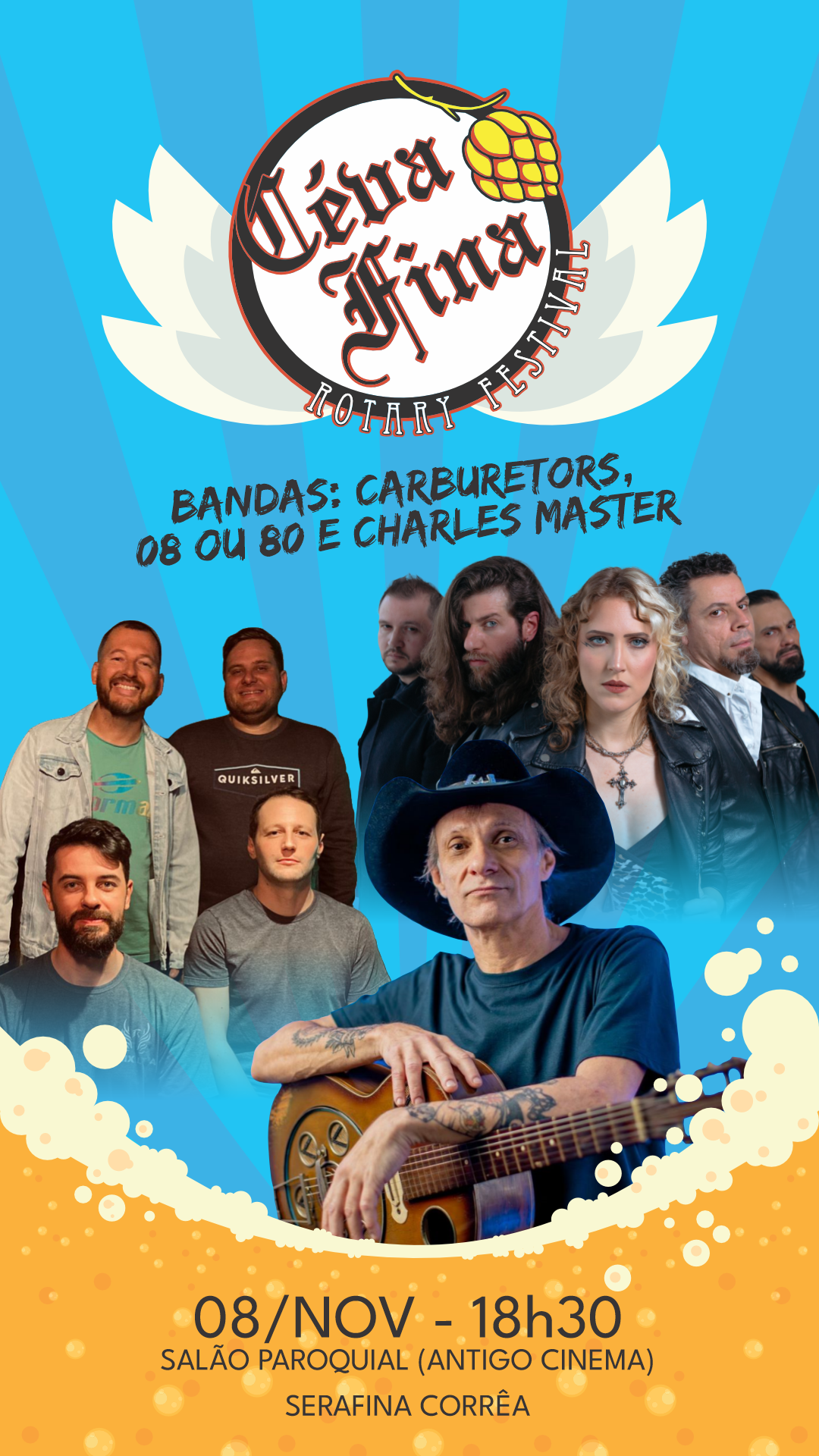 Vem aí o Cevafina 2025, a décima edição do festival de cerveja artesanal promovido pelo Rotary Club de Serafina Corrêa. Para animar a festa, teremos Carburetors, 8 ou 80 e Charles Master regrados de muita comida boa e cervejas de todos os estilos. Dia 08/11/2025, as 18h30, no Salão Paroquial (antigo cinema).