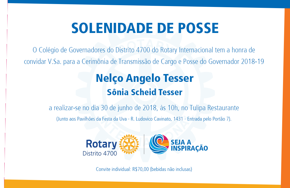 O Colégio de Governadores do Distrito 4700 do Rotary Internacional tem a honra de convidar V. Sa. para a Cerimônia de Transmissão de Cargo e Posse do Governador 2018-19.