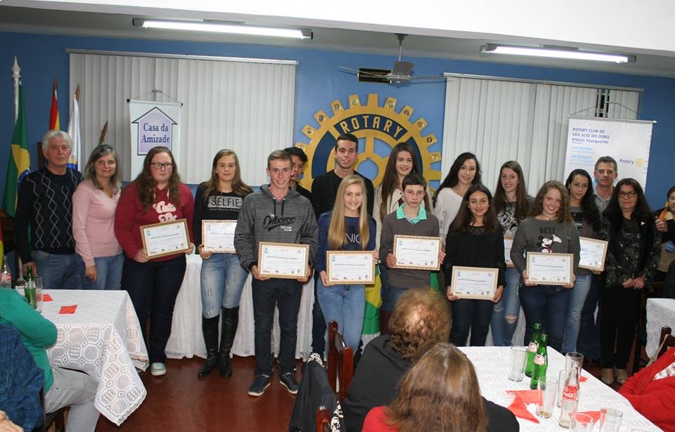 O Rotary Club de São José do Ouro realizou jantar de entrega de CERTIFICADOS DE MENÇÃO HONROSA para os ALUNOS DESTAQUE 2018, no dia 21 de junho de 2018, na sala de reuniões Eugênio Grassi ,sede social do Clube. Foram indicados 13 alunos pelas Escolas: Escola Estadual de Ensino Médio José Gelain cujo Diretor é Severino Bianchin, escola Estadual de Ensino Fundamental Professora Carmen Scoth Pacheco, Diretora Veronice Silveira Hoffmann,e Escola Municipal de Ensino Fundamental Luciano Antonio Dondé com a Diretora Sonia Moreira Machado.O Objetivo deste Projeto é valorizar os alunos que são exemplo de dedicação e respeito na Escola e Comunidade. O evento registrou a presença dos alunos, pais, familiares ,Rotarianos e Rotarianas que parabenizaram os homenageados. Os Alunos que receberam o reconhecimebto são: Paula B. Manfron,Maria Júlia V. Guisolfi, Fernanda M. da Silva,Eduarda B. Vanz, Gustavo Bernardi, Vagner Magnante, Almir dos Santos, Cleiton Debona, Gabriela Maldaner, Gabriela Graeff da Silva, Maria Fernanda Dutra, Ana Paula Pereira e Karoline Becker.